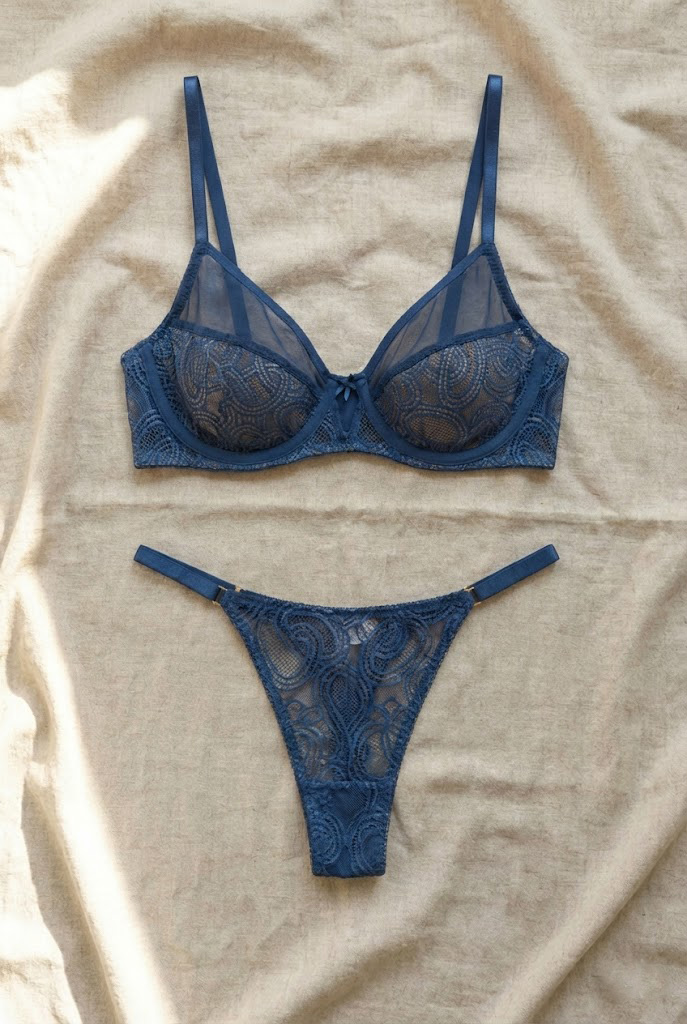 Вишуканий комплект, створений для жінок, які цінують комфорт і сучасну елегантність. Глибокий синій відтінок, прозора сітка та геометричний візерунок формують спокусливий і стильний образ.